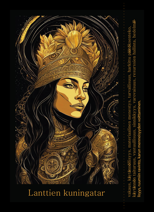 Kulta Tarot on upeasti illustroitu korttipakka jopa aloittelijan käyttöön. Sen reunassa on kortin nimi, numero/laatu sekä kortin tulkintaehdotus mikä helpottaa ja nopeuttaa korttien käyttönottoa ja omien tulkintojen syventämistä ilman oppaita. Osaavampaa tulkitsijaa varten löytyy katkoviiva, jota pitkin voi luottavaisesti kortista leikata seliteosion pois mikäli sille ei ole käyttöä. Kortit painetaan kultaiselle painopaperille ja ne henkivät vanhanajan arvokkuutta niin intarsiamaisuutensa kuin koristeellisuutensa takia. Korttipakka on yhä suunnitteluvaiheessa ja odottamassa tuotannollisia ratkaisuja, joten ilmiasu todennäköisesti hieman muuttuu niin illustraatioiden ja kultaviivojen osalta yksivärisempään tuotannollisista syistä. Kuvat ovat tällä haavaa viitteellisiä. Tilaa alta uutiskirje, jos kiinnostuit mahdollisuudesta ennakkotilata tämän kaunotarpakan. Uutiskirjeen mukana saat tiedon kun uudet ennakkomyyntikamppanjat alkaavat ja sekä paljon muuta oheistietoja kuten taidekaupan päivityksiä ja tarot-maailmaan liittyvää aineistoa.